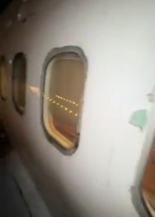 A very brief video shows two women standing by the side of an old plane. The camera is held at arm's length pointed toward the women and the plane. The plane is white and looks worn. The video shows the windows on the side of the plane. In the last few seconds the woman closest to the camera raises one arm. The scene takes place at night and the street is visible behind the plane.