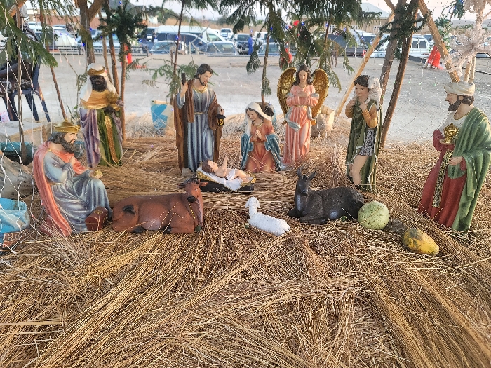 A nativity scene is set outside with hay as the ground cover. Statues of Joseph, Mary, baby Jesus, three wise men, an angel, a shepherd, a cow, a donkey, and a lamb surround the manger. Vehicles are visible in the background. The scene appears to be under a wooden structure adorned with lights and palm fronds.