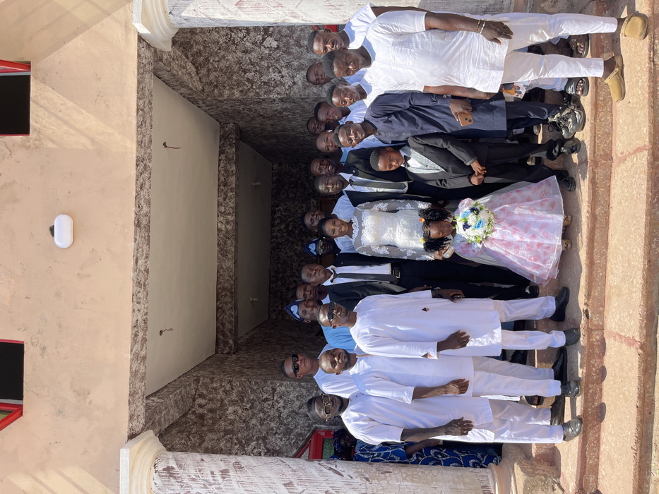 A group of approximately 25 individuals is posed for a photograph on a series of concrete steps leading up to a building in Unknown, Nigeria