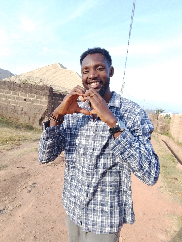 A smiling man is outdoors, making a heart shape with his hands. He wears a checkered shirt, a watch, and a beaded bracelet. A gold ring is visible on his finger. Behind him is a low brick wall topped with barbed wire, a house with a corrugated metal roof, and a dirt path. The sky is blue with a few clouds. A utility pole rises in the background. The scene appears to be a rural or suburban area.