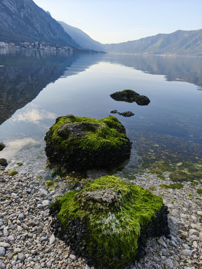 The image captures a static wide-angle view of a calm bay shoreline in Donji Orahovac, Montenegro. The foreground consists of a pebble and small rock beach leading into clear, shallow water. Two prominent rocks, extensively covered in vibrant green moss or algae, are partially submerged close to the shore; the larger rock, positioned left of center, also exhibits a dense covering of dark-shelled bivalves. Further out in the water, additional smaller, dark rock or growth formations are visible. The water's surface is smooth and highly reflective, mirroring the light blue sky and distant mountainous landscape. On the left side of the midground, a cluster of residential structures with light-colored walls and orange-tiled roofs lines the base of a large, steep mountain range. The mountains, rendered in shades of grey and blue, extend along both sides of the bay and recede into the background under a clear sky. No human subjects or active elements are present within the frame.