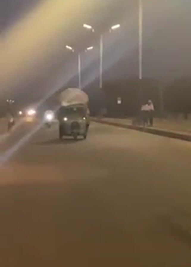 vehicle, possibly a motorized rickshaw, moving along a road at night. The vehicle is carrying a large, light-colored load on its roof. Streetlights illuminate the scene. Two people are standing on the side of the road. Other vehicles are visible in the distance.