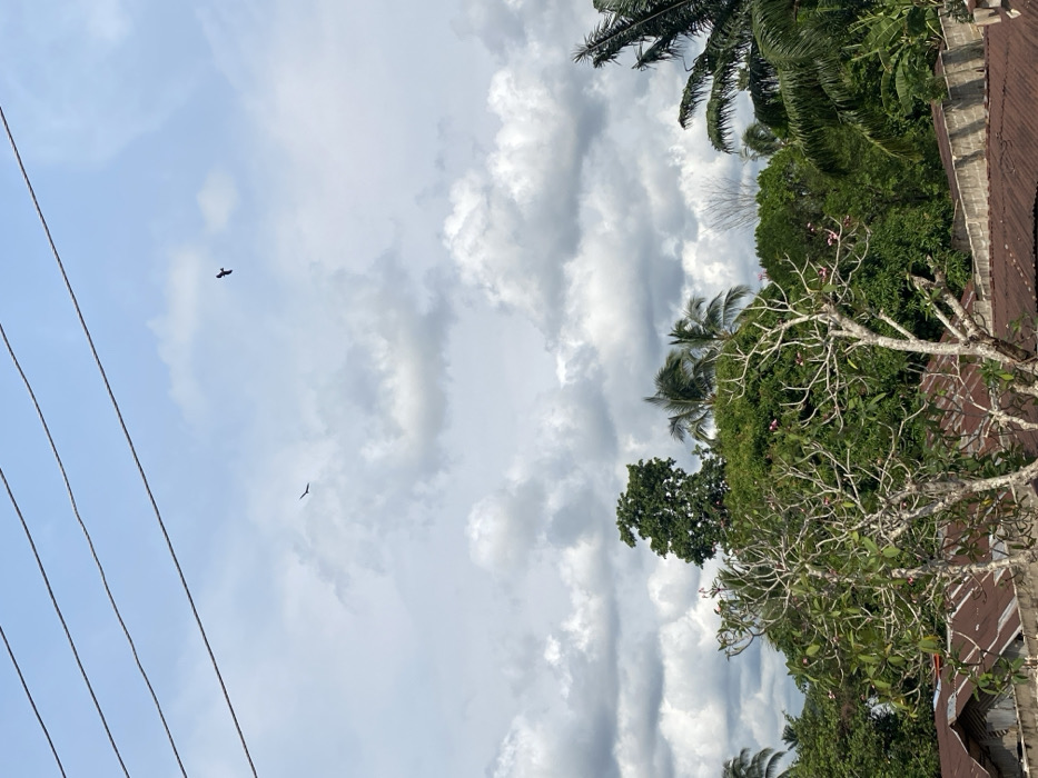 The image depicts an overhead view of a scene in Ufueseni, Nigeria, dominated by a partially cloudy sky and dense vegetation. The upper portion of the frame features a light blue-grey sky with scattered white and grey clouds. Four parallel, dark overhead lines, likely utility wires, extend diagonally across the upper left quadrant. Two dark avian silhouettes, appearing to be large birds in flight with outstretched wings, are visible against the sky; one is in the upper center and another slightly higher and to the right. The lower half of the image is filled with a dense canopy of trees. In the foreground, two trees with light-colored, gnarled branches and sparse green foliage are visible, exhibiting some small pink blossoms. Behind these, a thick expanse of lush green trees, including several tall palm trees on the right and center-left, forms the midground. Below the tree line, sections of several corrugated reddish-brown metal rooftops are apparent, along with fragments of light-colored block walls, indicating residential or commercial structures.