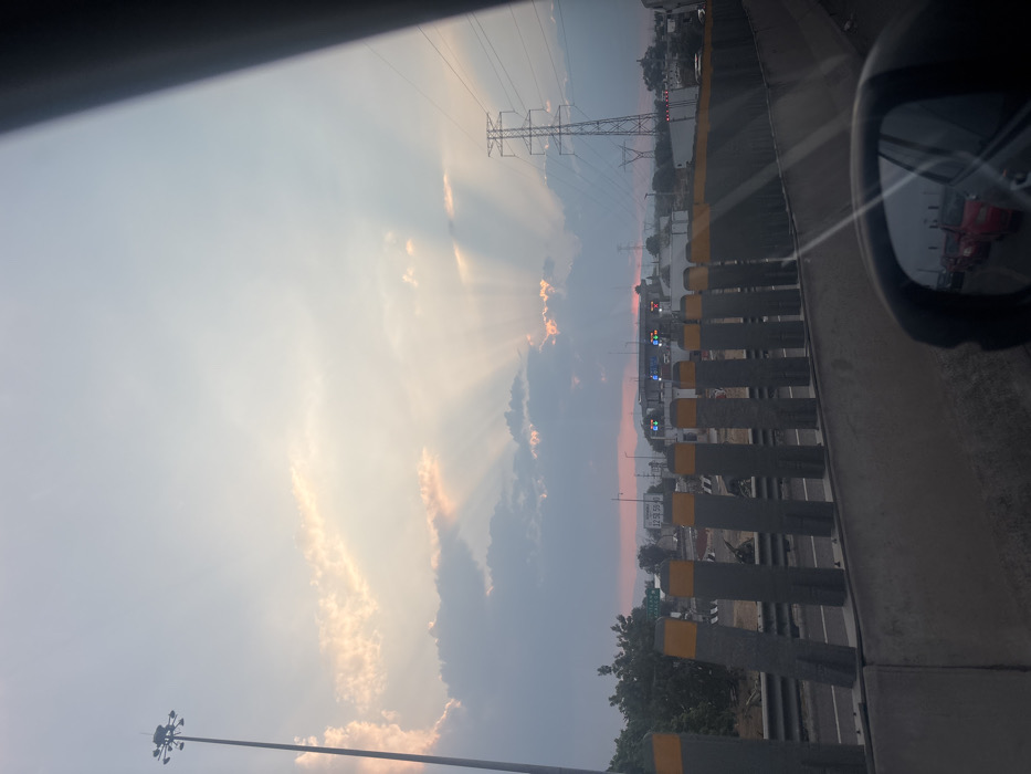 The image displays an exterior scene captured from a vehicle on an elevated roadway, likely an overpass or bridge, during sunset