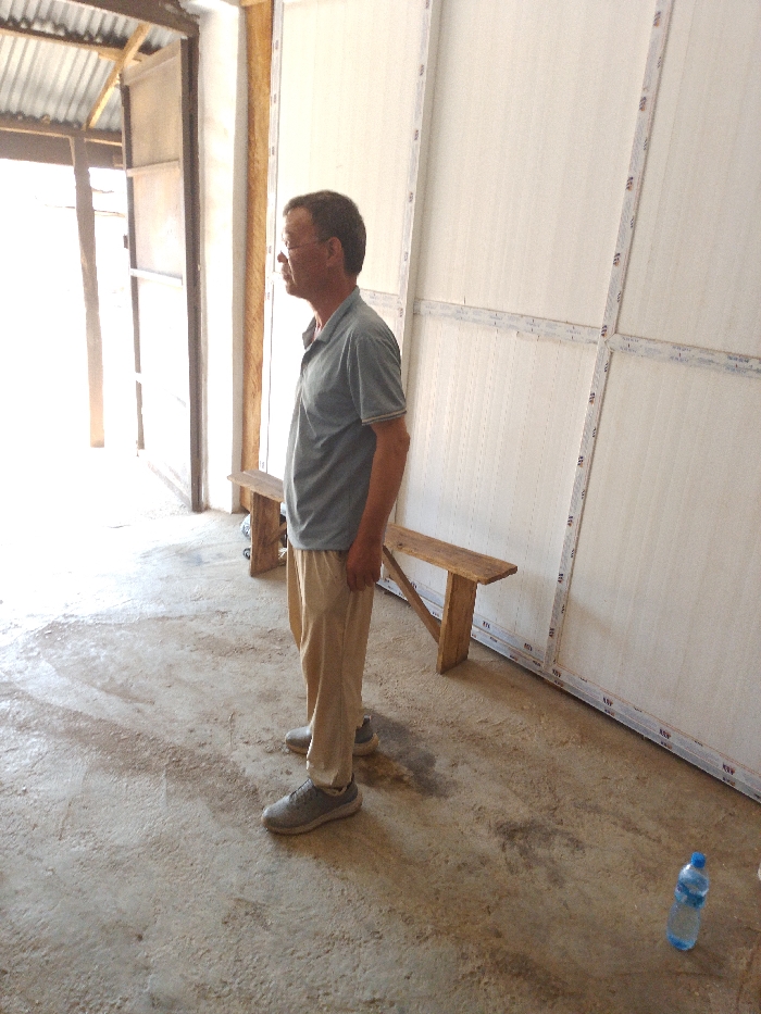 In Olomoda, Nigeria, an adult male stands in profile, facing left, within an interior space. He is wearing a light blue-grey short-sleeved polo shirt, light beige trousers, and grey athletic shoes. He has short dark hair and wears glasses. His hands are positioned at his sides. The floor is rough concrete with visible dirt and irregular dark stains. To the right, a wall is composed of multiple light-colored panels framed by white strips, creating a grid pattern. Two simple wooden benches with angled supports are placed against this panelled wall behind the man. To the left, a brightly lit open doorway or passageway reveals an exterior view, including a corrugated metal roof section and wooden structural elements. A blue plastic water bottle with a white cap is visible on the concrete floor in the lower right foreground. No direct actions or interactions are depicted.