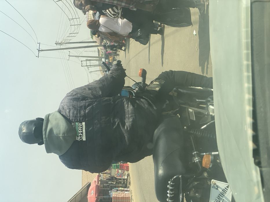 bustling street scene in Narayi, Nigeria, viewed from inside a stationary vehicle. In the immediate foreground, a person rides a dark motorcycle, seen from behind. The individual wears a dark baseball cap, a light green hooded sweatshirt with the hood up, and a dark, quilted jacket with the text "AT COMPANY ARMANI THIEFLY" displayed in white on the upper back. Their pants are dark with a camouflage pattern visible on the thighs. The motorcycle features a black padded seat, a chrome rear grab rail, and an orange rear turn signal. A partially obscured license plate on the rear fender displays "LAFIA." To the left of the motorcycle, a market area is visible with a single-story building featuring a reddish roof, red umbrellas, and stacks of crates, indicating street vending. To the right and extending into the background, multiple pedestrians are present on the paved road and its dirt shoulders, some carrying dark bags. Utility poles with numerous overhead power lines line both sides of the street, receding into the hazy distance under a bright sky. The road surface appears to be asphalt.