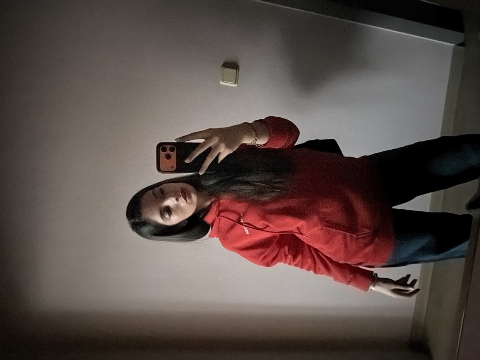 A young female with long, dark hair is reflected in a mirror, taking a selfie indoors in Rudartsi, Bulgaria