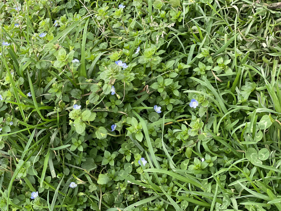 The scene displays a dense patch of mixed green ground cover, described as being in Batumi, Georgia. The vegetation consists of varied broadleaf plants, including small-leaved species and clover, interspersed with blades of grass. Numerous small, four-petaled flowers, primarily light blue to lavender with white centers, are scattered throughout the foliage; these are consistent with *Veronica persica* (Persian speedwell). The plants appear lush and vibrant green. No individuals, animals, man-made objects, or specific actions are present within the frame.