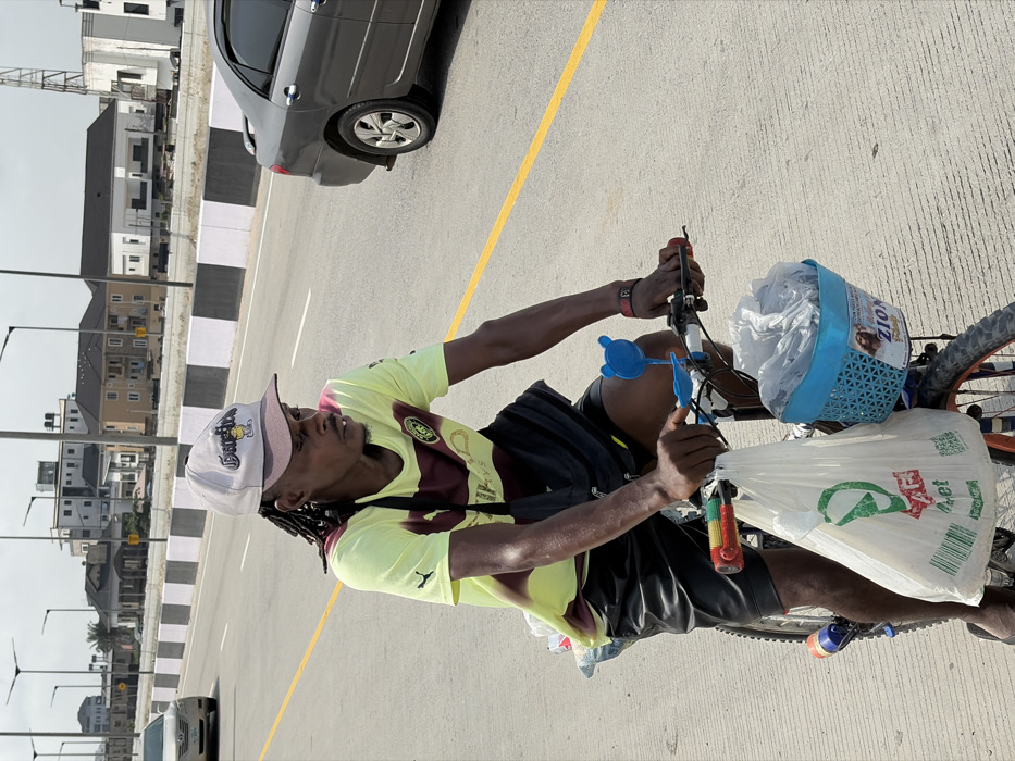 A dark-skinned male with dreadlocks, wearing a light yellow and maroon short-sleeved shirt, black shorts, dark flip-flops, and a white and brown baseball cap, is actively riding a bicycle on a paved road in Jakande, Nigeria