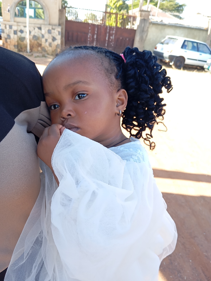 - "In Barakin Gangare, Nigeria, a young child with dark skin and dark eyes is depicted from the mid-torso up, held by an adult whose left arm and shoulder are visible in the left foreground, dressed in a black and beige garment" by FM-hF7Ke2, licensed under CC BY 4.0