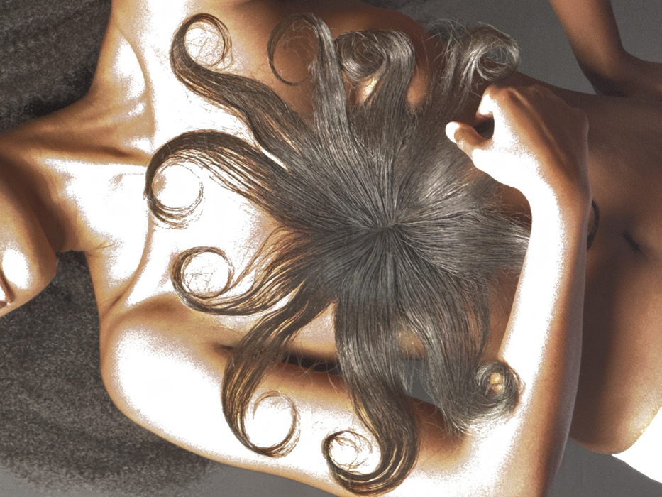 This image is a close-up studio portrait of an individual's upper torso and head, framed against a plain, dark gray background. The scene does not depict an identifiable location within the city of Cachan, France; it is a controlled studio environment. The subject is a person with medium-dark skin, which appears to be enhanced with a shimmering, possibly metallic, cosmetic application, particularly visible on the chest, shoulders, and chin. The individual's head is partially visible at the top, showing dark, coily hair and the lower portion of the face, including the mouth and chin, with the mouth closed. A prominent and intricately styled mass of dark, straight hair, resembling a wig or hairpiece, is centrally positioned on the individual's chest, covering the sternum and portions of the breasts. This hairpiece features a distinct circular central parting from which numerous strands radiate outwards. Several of these strands are meticulously curled into large spirals at their ends, distributed across the chest and shoulders. The subject's left hand, with the thumb and a portion of the palm visible, is positioned at the lower right section of the hairpiece, appearing to gently touch or support it. The upper body of the individual is bare, with a sliver of white fabric visible at the bottom edge of the frame, suggesting a garment covering the lower abdomen. The lighting is direct, highlighting the contours of the body and the textured details of the hair.