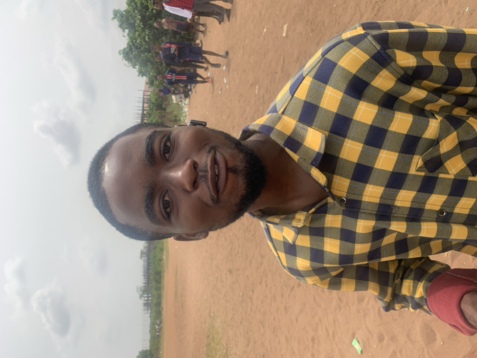 The image depicts a daytime outdoor scene located in Ihiagwa, Nigeria, specifically an open, unpaved reddish-brown dirt field under an overcast sky with scattered white clouds. In the foreground, a young adult Black male faces the camera, smiling faintly. He has short black hair, a neatly trimmed beard with a soul patch, and a black wireless earbud in his right ear. He is wearing a long-sleeved yellow and dark blue plaid shirt, unbuttoned at the collar. A portion of a red fabric object, possibly a glove or cloth, is visible clutched in his left hand, which is out of frame. The background shows additional individuals and environmental features. To the left, in the mid-distance, a light-colored, multi-tiered structure, possibly an unfinished building or framework, is partially visible above a line of green foliage. To the right, a group of approximately eight to ten individuals, predominantly young adult males, are gathered on the dirt field. Some are wearing sports jerseys (one distinctly a dark blue Paris Saint-Germain jersey), others wear casual clothing, and one male is shirtless. They appear to be standing, walking, or interacting casually. Dense green foliage forms a partial backdrop behind this group. The ground exhibits minor debris, including small white and green fragments.
