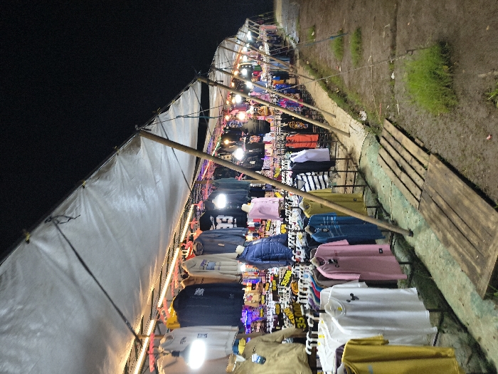 This image depicts a nighttime view of an outdoor market stall in An Khe Ward, Vietnam. A long, continuous white tarp canopy, supported by numerous wooden poles, extends from the foreground into the deep background, creating a covered aisle. Beneath the canopy, multiple bare light bulbs and some colorful string lights illuminate an extensive display of clothing. Various garments, including hoodies, t-shirts, jackets, and shirts, are neatly arranged on hangers suspended from metal racks. Visible price tags, such as "35.000", are attached to some items. The ground beneath the market stall is unpaved, consisting of packed dirt or mud with sporadic patches of green grass. In the immediate foreground, a makeshift walkway constructed from wooden planks bridges a narrow, shallow ditch or channel. No individuals are visible within the frame, and no specific actions or interactions are occurring. The scene presents a static view of the market setup.