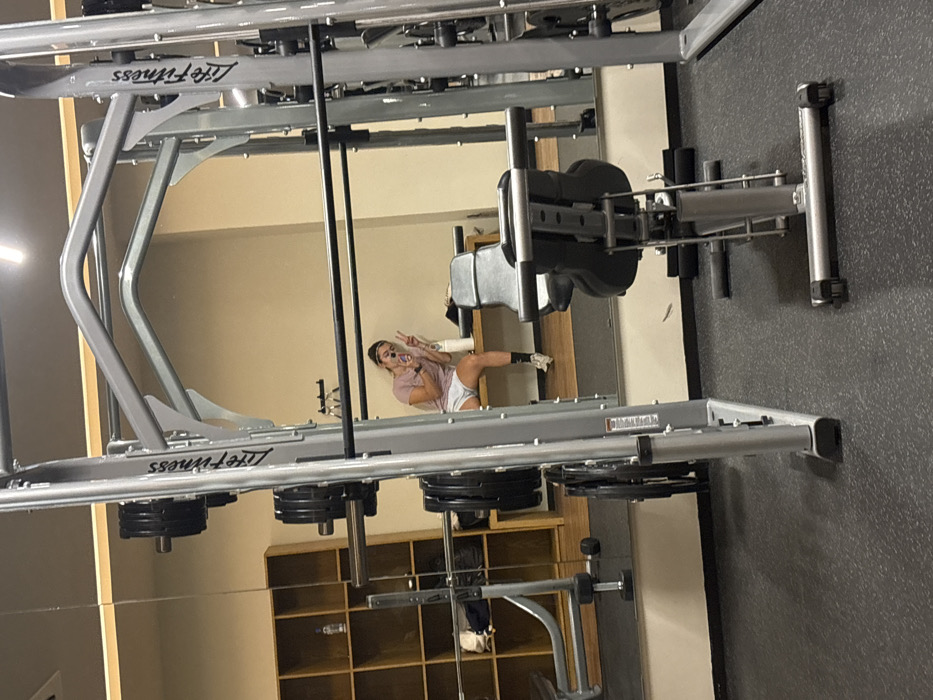 mirrored gym setting with exercise equipment, including a Life Fitness machine with weight plates