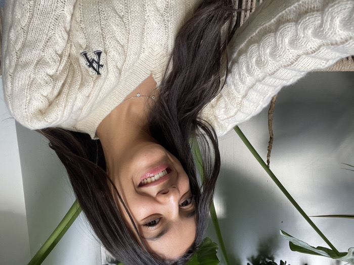 A woman smiles towards the camera, her dark hair cascading over a cream-colored cable-knit cardigan with a black monogram. She wears a delicate silver necklace. The background features a plant with large green leaves and a softly shadowed wall. The image is slightly rotated, giving it a casual and inviting feel.