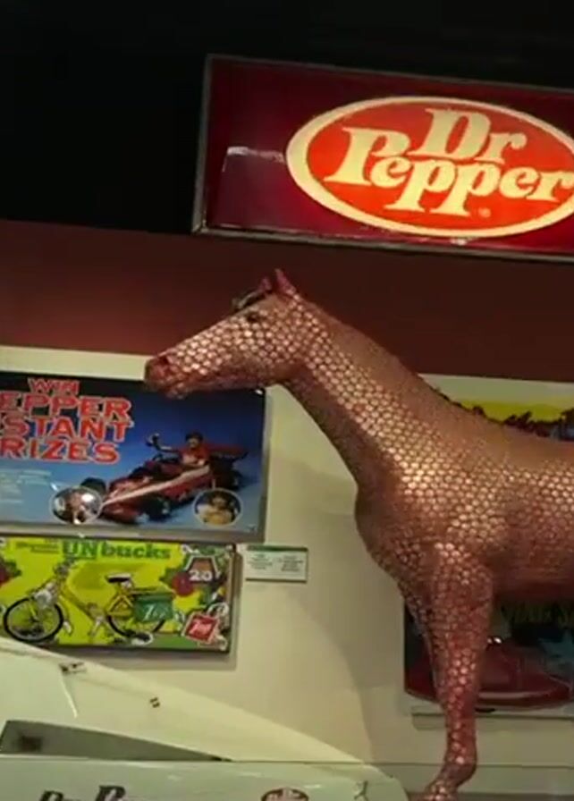 The camera pans up to focus on a life-size horse sculpture covered in what appear to be Dr. Pepper bottle caps. The sculpture is reddish-brown in color and positioned within a Dr. Pepper museum or display. Behind it is a Dr. Pepper sign, while other Dr. Pepper-related promotional items and displays are visible in the surrounding environment.