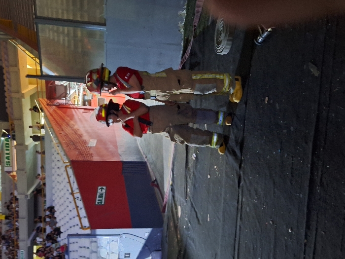 Two firefighters in full uniform stand on a black tarp in front of a brick wall with a "SALIDA" sign. The sign indicates an exit. The firefighters are standing on a black tarp, which is located beneath a set of bleachers. There is a fire hose and a nozzle on the ground to the right of the firefighters. The scene is located at the Estadio Nacional in La Victoria, Peru. The coordinates -12.068, -77.033 correspond to the location of the Estadio Nacional. The firefighters are at the entrance to the stadium, on the lower level, facing the bleachers. The scene is illuminated by artificial lights. The photo is taken from a slightly elevated perspective, looking down at the firefighters.