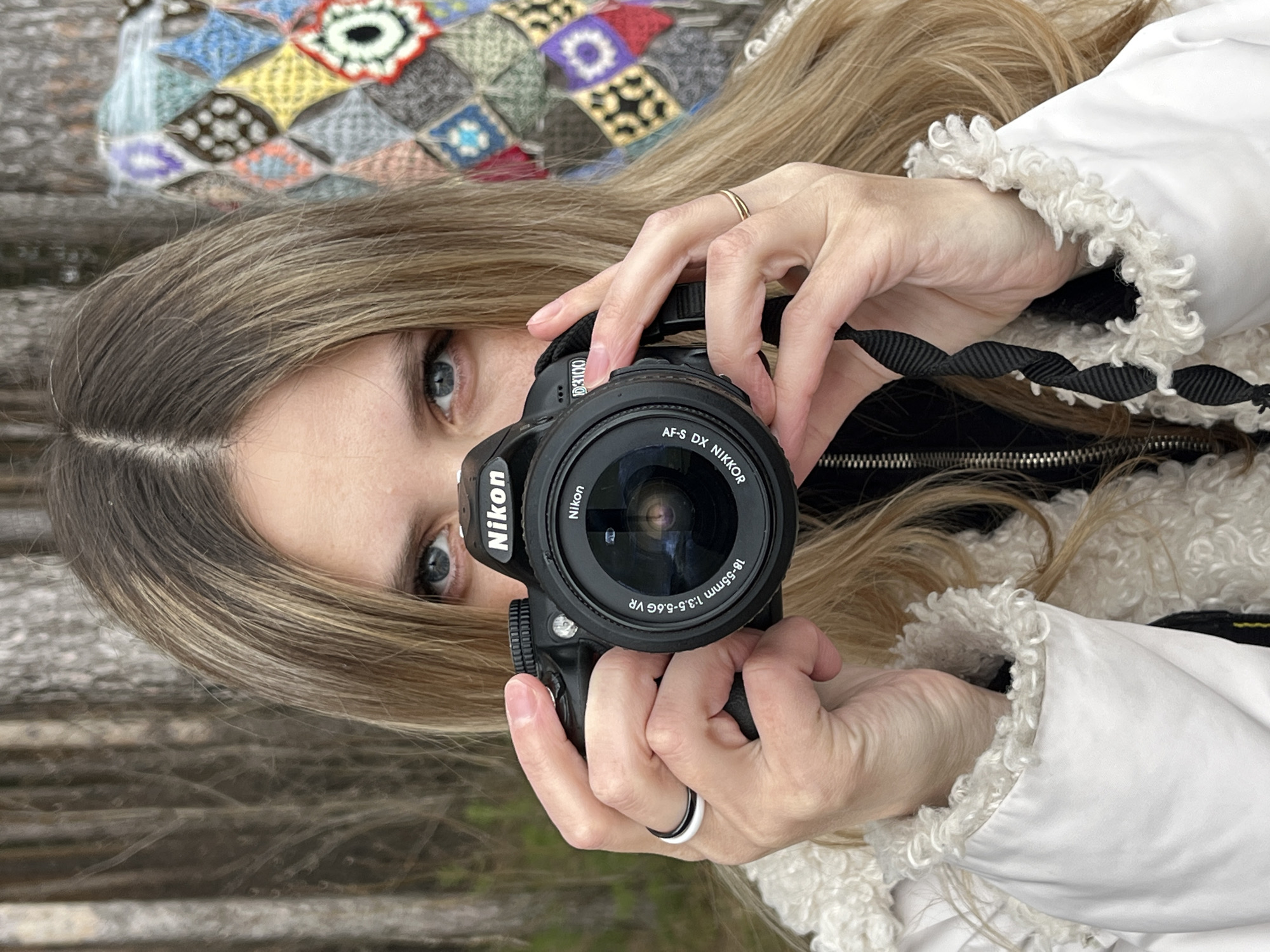 A woman with long, highlighted blonde hair is holding a Nikon D3100 DSLR camera with an AF-S DX Nikkor 18-55mm lens. The woman's eyes are light blue. She's wearing a white jacket with a textured, almost sheepskin-like collar and a black jacket underneath. The woman has a silver ring on her left hand and a gold ring on her right. The background includes weathered wooden planks and a multicolored knitted blanket with geometric patterns. The location is Chaikovsky, Russia.