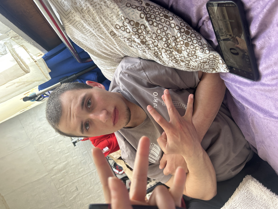 The image depicts a young adult male in an indoor residential setting in Plovdiv, Bulgaria. The subject, with short, dark hair and a light goatee, wears a grey t-shirt bearing a white barcode graphic and the word "TOKYO." He is seated or reclining on a purple, plush blanket, leaning against a large pillow with a brown and white geometric pattern. His right arm is crossed over his chest, with his fingers forming a distinct 'W' or 'M' gesture. He maintains direct eye contact with the camera, exhibiting a neutral expression. In the immediate foreground, a second person's left hand is partially visible, performing a "peace" sign with two extended fingers. To the subject's right, a black smartphone with a cracked screen lies face up on the purple blanket, reflecting an overhead light source. The background reveals a light-colored, textured wall. Various objects are present, including a red fabric item, a dark blue garment, and what appears to be part of a cleaning tool or stand. A window, partially covered by light-colored, sheer curtains, is visible to the upper right, adjacent to a dark wooden furniture piece, possibly a headboard.
