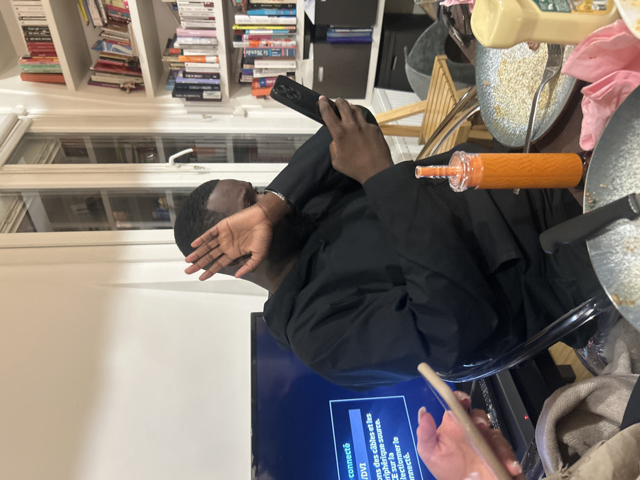 This image depicts an indoor scene in a residential setting within Puteaux, France. A dark-skinned male subject, with short hair and wearing a black hooded jacket, is seated at a table. His left hand is raised, palm facing the camera, partially obscuring his face. His right hand holds a dark-colored smartphone, which he is actively viewing. To his immediate left, a light-skinned female hand is partially visible, holding a light-colored rectangular object, possibly another mobile device. The table is cluttered with post-meal items. Visible objects include a metal pan containing food remnants, a fork, a black-handled knife, a yellow squeeze bottle (likely condiment), and crumpled pink paper napkins. A prominent orange-colored shisha or hookah pipe, with a clear mouthpiece and base, stands upright on the table. A beige blanket or throw is also partially visible on the table's edge. In the background on the left, a television screen displays text in French, indicating an input connection issue, with phrases such as "connexte" and "câbles et les périphérique source." On the right, a white bookshelf filled with numerous books of various colors and sizes is visible. Behind the male subject, a large window with white frames shows a partial reflection of the room. The overall lighting suggests an interior illuminated by artificial sources.