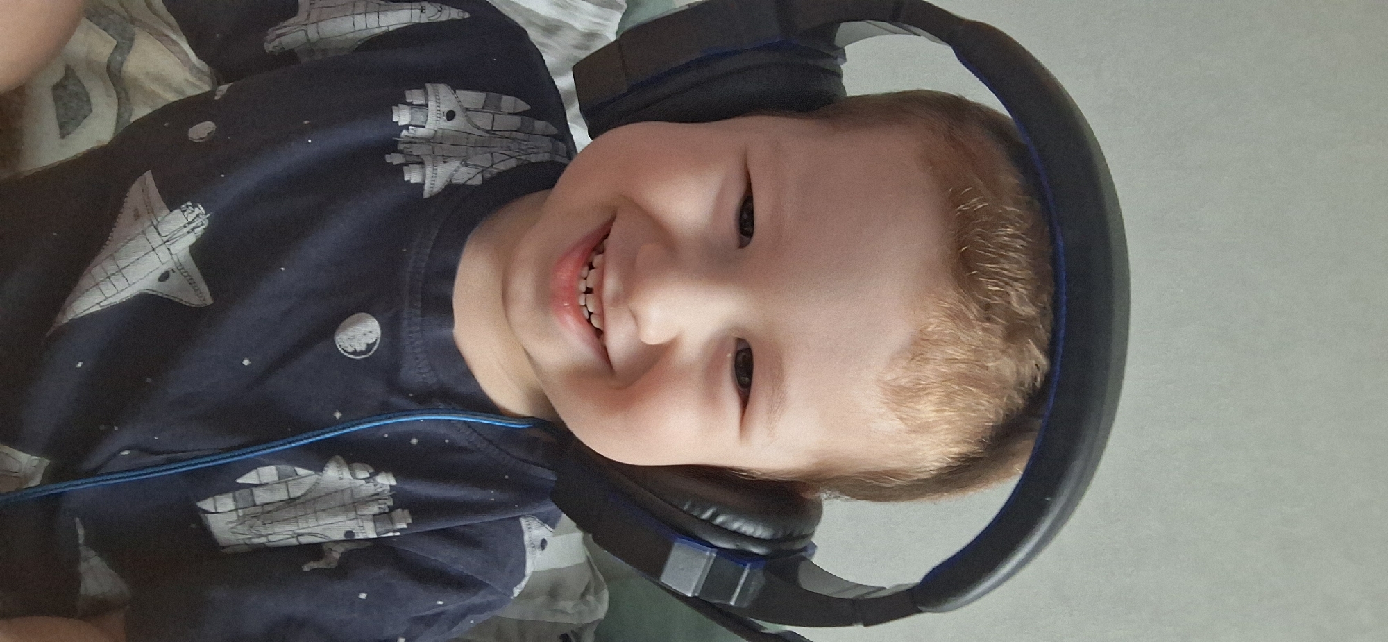 A young, fair-skinned, red-haired child is lying down, smiling and wearing black headphones. The child is wearing a dark blue t-shirt with images of spaceships and a moon on it. The background appears to be bedding. It is not possible to determine the location as Chaikovsky, Russia or any other specific location based on this image.