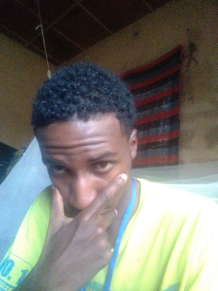 An individual, identified as a young adult male with dark skin and short, tightly curled black hair, is depicted in an indoor setting within Jos, Nigeria