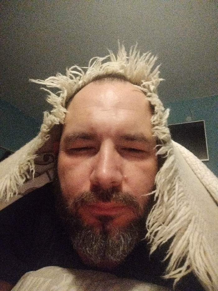 A close-up, low-angle image depicts an adult male in an indoor setting. The male, with a dark beard and mustache, faces the camera directly with his eyes closed, suggesting rest or sleep. A light-colored, cream-toned textile featuring prominent fringe is draped over his head and shoulders, serving as a cover. A dark garment is visible beneath the textile. The background consists of a muted blue-green wall. To the subject's right, a dark, rectangular flat-screen television is mounted on the wall. A patterned object, partially visible behind the subject's left ear, shows a stylized circular form. The environment is dimly lit, and the image exhibits digital noise. The specific location in the city of Rosen, Bulgaria, is not discernible from the visual evidence.
