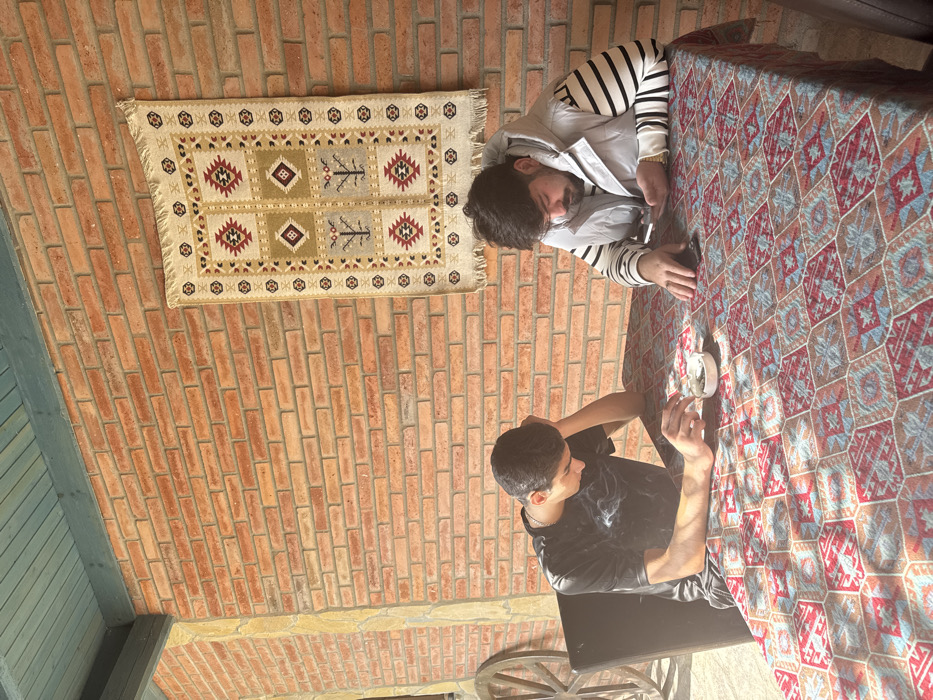 The image depicts two males seated at a rectangular table on a covered patio or veranda in Kvakhvreli, Georgia, illuminated by strong sunlight