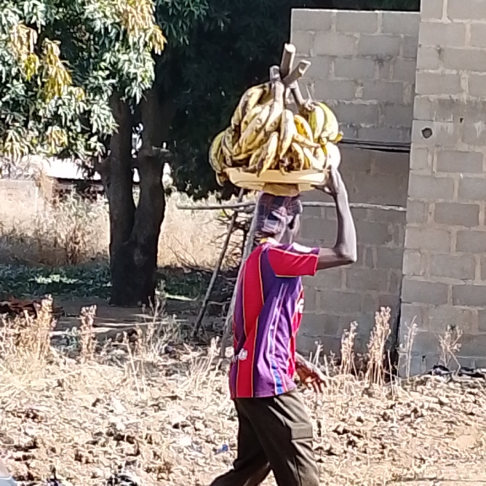 A person is carrying a large platter piled high with bananas on their head, balancing it with one hand. They are wearing a red and purple shirt and dark pants, walking along a dry, grassy area with a tree to the left and a brick structure to the right. The scene is bathed in bright sunlight.
