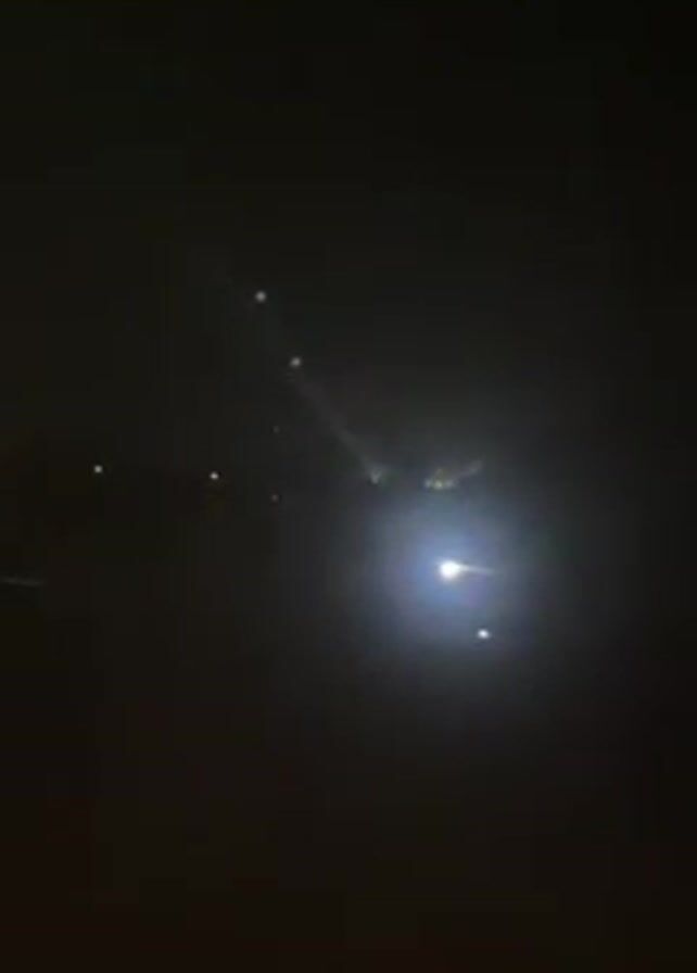 The video is a dark and shaky shot of the night sky with a few distant lights visible in the foreground