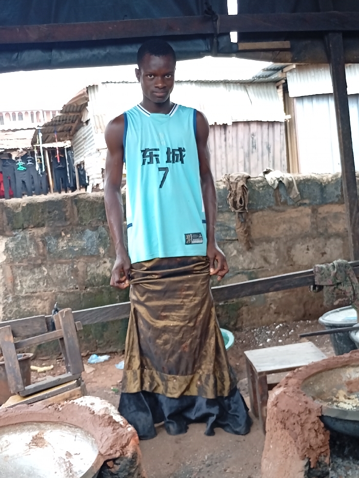 An image depicts a young Black male standing centrally in an outdoor, semi-enclosed area in Obosi, Nigeria. The individual, appearing to be in his late teens or early twenties, has short dark hair and a neutral expression, looking directly at the viewer. He wears a light blue sleeveless basketball jersey featuring Chinese characters and the number "7" on the front. Below the jersey, he is clad in a dark, possibly black, undergarment, covered by a long, shimmering gold-bronze colored fabric wrapped around his waist, extending to his ankles. His hands are positioned at his waist, holding the wrapped fabric. The environment suggests a functional workspace or informal settlement. Overhead, a dark tarp or fabric is stretched across wooden beams, forming a rudimentary roof. The ground is bare earth. To the subject's left, a large, round metal pot is partially embedded in a reddish-brown earthen structure, likely a stove. A wooden frame or piece of equipment is nearby. In the background to the left, behind a low wall, corrugated metal structures are visible, with dark garments hanging on a line. To the subject's right, another identical pot, also embedded in an earthen structure, contains a light-colored substance. A small wooden stool is positioned next to this pot. A rough wall made of concrete blocks or similar material forms part of the background, with more corrugated metal structures and some vegetation in the distance.