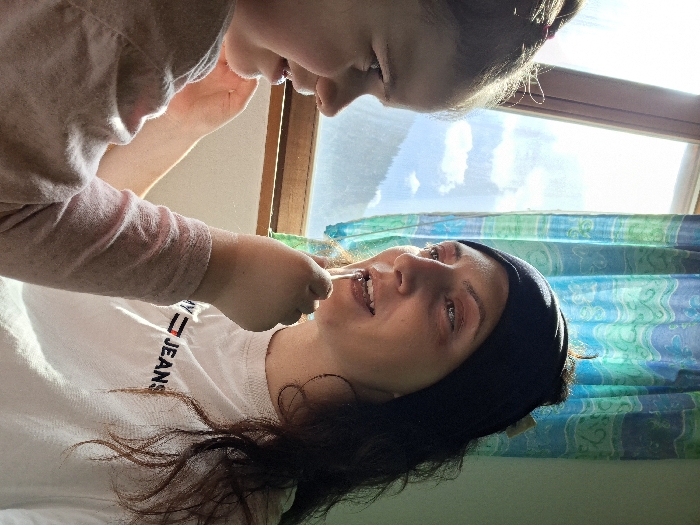 The image captures an indoor scene in Davos, Switzerland, illuminated by natural light from a window. Two individuals, an adult woman and a young child, are positioned next to the window. On the left, a young girl, estimated to be between three and six years old, is shown in profile, facing right. She has dark hair partially tied back and wears a light pink long-sleeved top. Her left arm is raised, and her hand holds a clear tube applicator, which she is actively placing against the adult woman's lips. Her attention is focused on the adult. On the right, an adult woman, appearing to be in her mid-20s to late 30s, is seen with her head turned slightly left, facing the child. She has dark, wavy hair, mostly contained by a black headband. She wears a white short-sleeved t-shirt featuring the "TOMMY JEANS" logo in black and red text across the chest. Her mouth is slightly open, indicating she is receiving the application to her lips. Pink eyeshadow is visible on her eyelids. The background features a wooden-framed window, through which a bright sky with white clouds is visible above a steep, tree-covered mountainous landscape, consistent with an alpine environment. To the right of the window, a curtain with a blue and green patterned design is visible. The immediate interior wall appears light-colored.