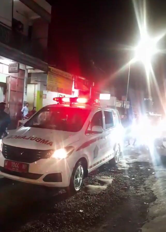 n ambulance parked on a city street at night. The ambulance is white with red stripes and the word "AMBULANCE" written on the side. It has its red lights flashing on the roof. There are several people standing around near the ambulance, and some are looking at the camera. The street is wet and dimly lit by streetlights. There are buildings visible in the background. The ambient sound includes someone reciting a religious text.