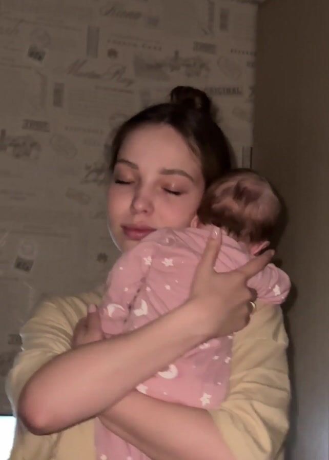 A woman is holding a baby. The woman has her hair in a bun and is wearing a beige shirt. The baby is wearing a pink onesie with moons and stars on it. The woman is facing the camera with her eyes closed. The baby is facing away from the camera. The background is a wall with patterned wallpaper. There is also a cabinet or closet visible on the right side of the frame. Music is playing in the background.