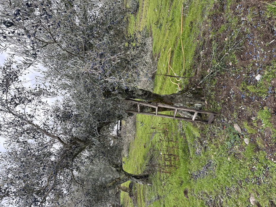 This image depicts an olive grove located in Freixo de Espada à Cinta, Portugal, under an overcast sky. The foreground and midground are dominated by several mature olive trees, heavily laden with dark, ripe olives. A wooden ladder, featuring approximately five steps, leans against the trunk of a central olive tree on the right side of the frame. The ground beneath the trees consists of green grass interspersed with patches of disturbed brown earth. Numerous dark olives are scattered across the ground, particularly near the base of the central tree, alongside fallen branches and foliage. A yellow hose or cable extends across the grassy ground to the right of the central tree. In the background, partially obscured by the olive trees, a white truck or van is visible. No individuals are present within the scene. The presence of the ladder and scattered olives suggests ongoing or recently completed olive harvesting activity.