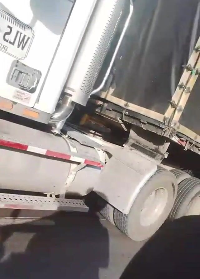 white Freightliner semi-truck driving on an asphalt road. The truck has a yellow container attached. The truck's license plate is partially visible, reading "SOB 2JW". The camera moves around the truck, showing different angles of the tires and the cab. The background includes trees and a blue sky. The road has a white line marking the lane. There are shadows of a person holding the camera visible in the frame.