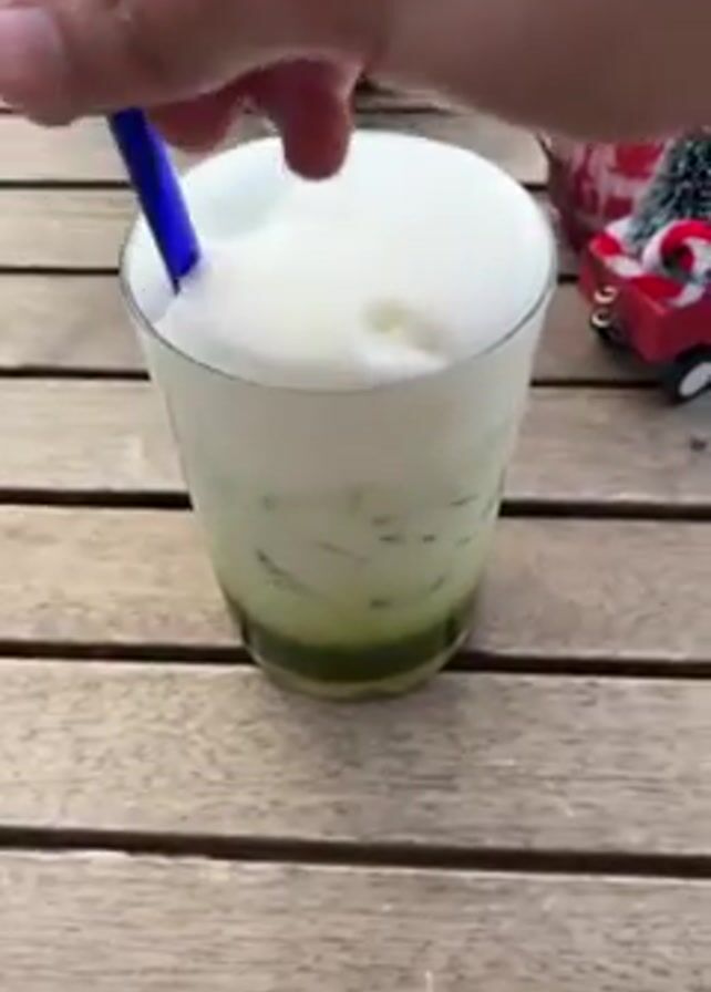 A hand holding a blue straw is stirring a green and white beverage in a clear plastic cup on a wooden table. The cup contains a green liquid at the bottom, ice cubes, and a thick white foam on top. Another cup with a green beverage is visible in the background, along with a small red toy car with a Christmas tree. The hand stirs the drink, mixing the foam and green liquid.