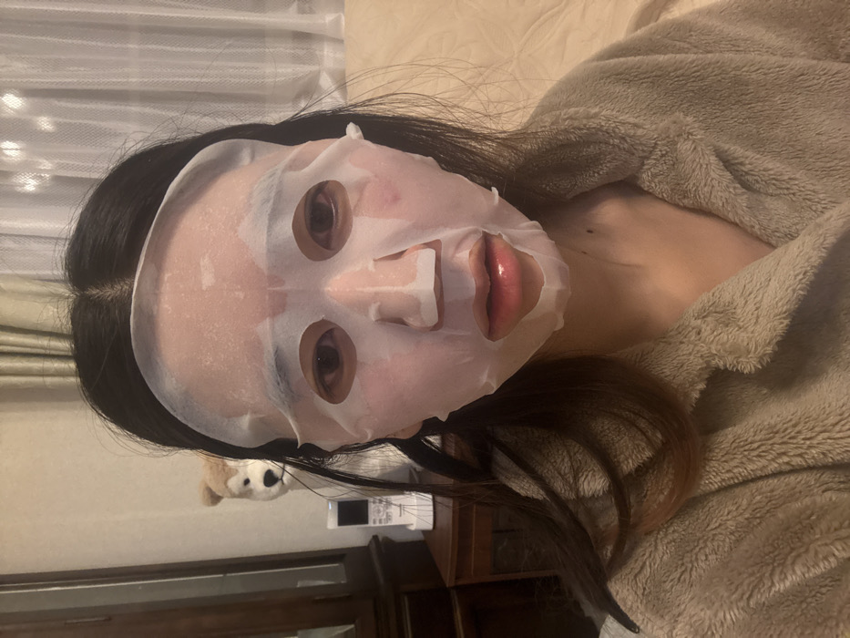 An indoor scene in what appears to be a private residence in Kawasaki, Japan, depicts a female individual undergoing a facial treatment. The subject, positioned centrally, presents her face covered by a white, translucent sheet mask, which adheres to her skin, revealing her dark eyes and partially open lips. Her dark hair frames her face, and she is wearing a light brown, fuzzy-textured garment, likely a robe or a pajama top. To the left background, a dark wooden side table supports a white electronic device, resembling a cordless phone or intercom unit, behind which a light-colored plush toy, appearing to be a dog, is partially visible. The right background features light-colored, vertically pleated curtains or blinds, with a soft, light-colored surface, possibly a wall or upholstered furniture, behind them. The lighting is consistent with indoor artificial illumination.