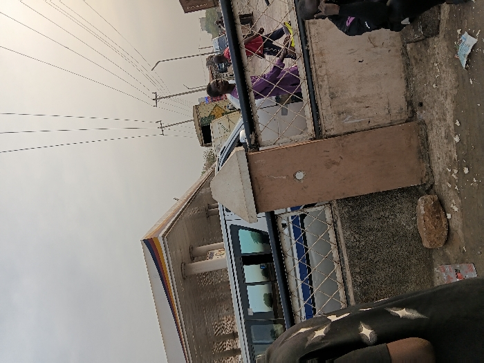 A gas station awning with yellow, blue, and red stripes sits above a partially visible bus. The sky is overcast. Adjacent to the station, people gather near a wire fence and concrete structure. Power lines stretch across the sky. A person is partially visible in the upper right corner.