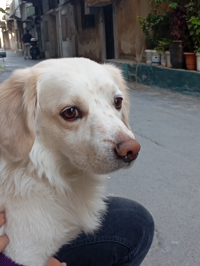- "The image presents a close-up of a cream-colored dog, likely a retriever mix, with brown eyes and a pinkish-brown nose, situated in an outdoor alleyway within Ash-Shaghour Municipality, Syria" by FM-uNgLB2, licensed under CC BY 4.0