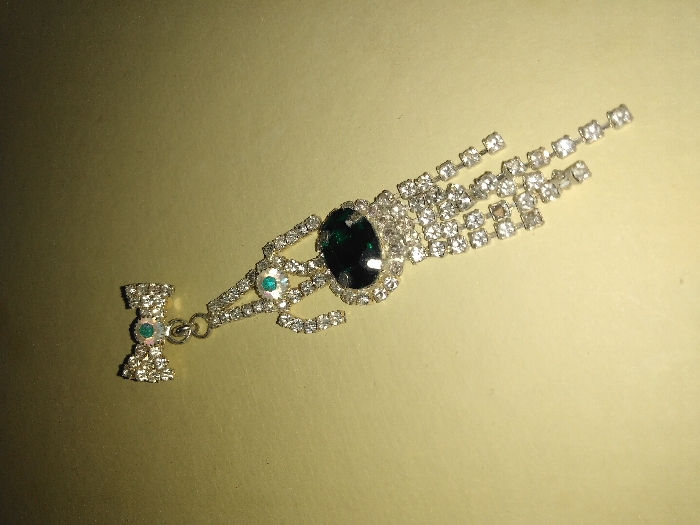 The image displays a single piece of ornate costume jewelry, positioned centrally on a uniform, light tan or beige surface. The item is constructed from silver-toned metal, intricately adorned with numerous clear rhinestones and colored imitation gemstones. The uppermost component is a small bow-shaped element, completely encrusted with clear rhinestones. A small, iridescent light-blue or teal circular stone is set at its center. This bow is linked via a single silver ring to the main body of the jewelry. The central design features an abstract, geometric structure, also paved with clear rhinestones. Within this segment, another small, iridescent light-blue or teal circular stone is visible. Below this, a prominent, oval-shaped, dark green faceted stone, resembling an emerald, serves as the focal point, surrounded by a bezel of clear rhinestones. Suspended from the bottom of the large green stone are multiple strands of dangles. Each strand consists of individually linked square-cut clear rhinestones, creating a fringe-like effect. The entire piece is illuminated by what appears to be artificial light, creating subtle reflections and shadows. The background provides no discernible contextual information to identify a specific location within the city of Caracas, Venezuela, or any other geographical area. No people or actions are depicted.