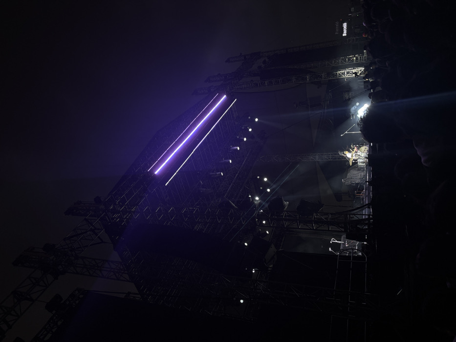 The image depicts a large-scale outdoor night concert at the Autódromo Hermanos Rodríguez in Mexico City, Mexico. A massive metal truss stage structure, dark against the night sky, occupies the upper and mid-ground. Two prominent parallel horizontal purple light strips are affixed to the top portion of the stage trussing. Below these, multiple white spotlights illuminate the stage. On the stage, a drummer is seated at a drum kit in the center-right, brightly lit by a spotlight, with other band members or equipment partially visible. The foreground is filled with a dense, silhouetted crowd, indicating a large audience observing the performance. To the far right, a vertical sign displaying "Barceló" is visible, suggesting a sponsor or nearby structure. The overall environment is dark, with artificial lights from the stage serving as the primary illumination.