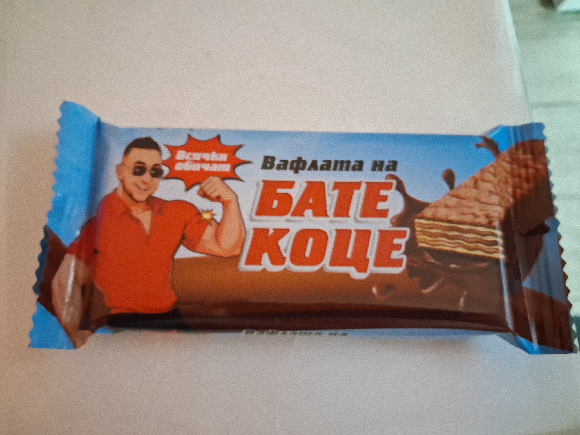 A packaged wafer bar is depicted resting on a light-colored, flat surface within an indoor setting in Varna, Bulgaria. The rectangular packaging features a prominent design with a blue border and a central brown area. Illustrated on the wrapper is a cartoon-style man, smiling and wearing sunglasses and a red collared shirt, flexing his right bicep, which is adorned with a stylized yellow burst. Above the man's bicep, a red speech bubble contains the Cyrillic text "Всички обичам" (I love everyone). To the right of the illustration, large red Cyrillic text reads "БАТЕ КОЦЕ" (Bate Kotse), preceded by "Вафлата на" (The wafer of). A multi-layered chocolate wafer, partially broken with chocolate drips, is also illustrated on the right side of the package. The background behind the object is uniformly light and out of focus.
