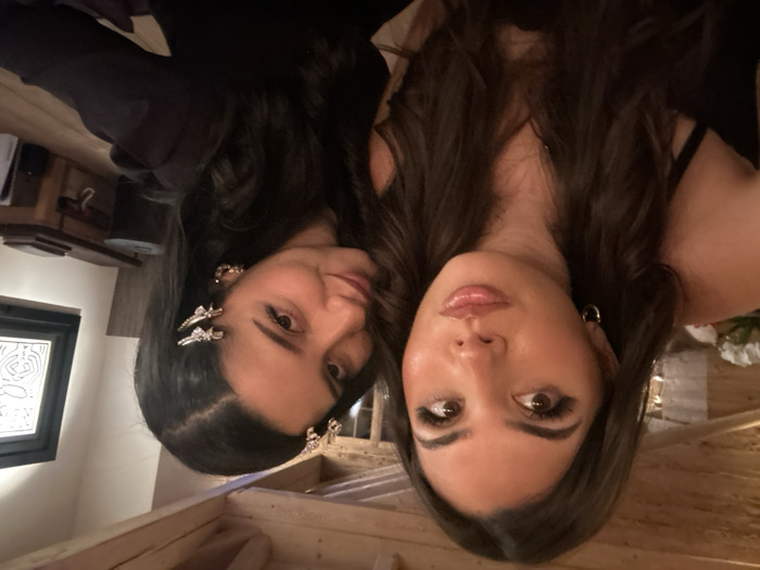 Two women pose closely for a picture. The woman on the left has dark hair adorned with butterfly clips and wears gold hoop earrings. The woman on the right has similar hair, styled in loose waves, and gold hoop earrings. Both women wear dark tops. The background includes a side table, framed art, wooden beams, and flowers. The photo appears to have been taken at an angle.