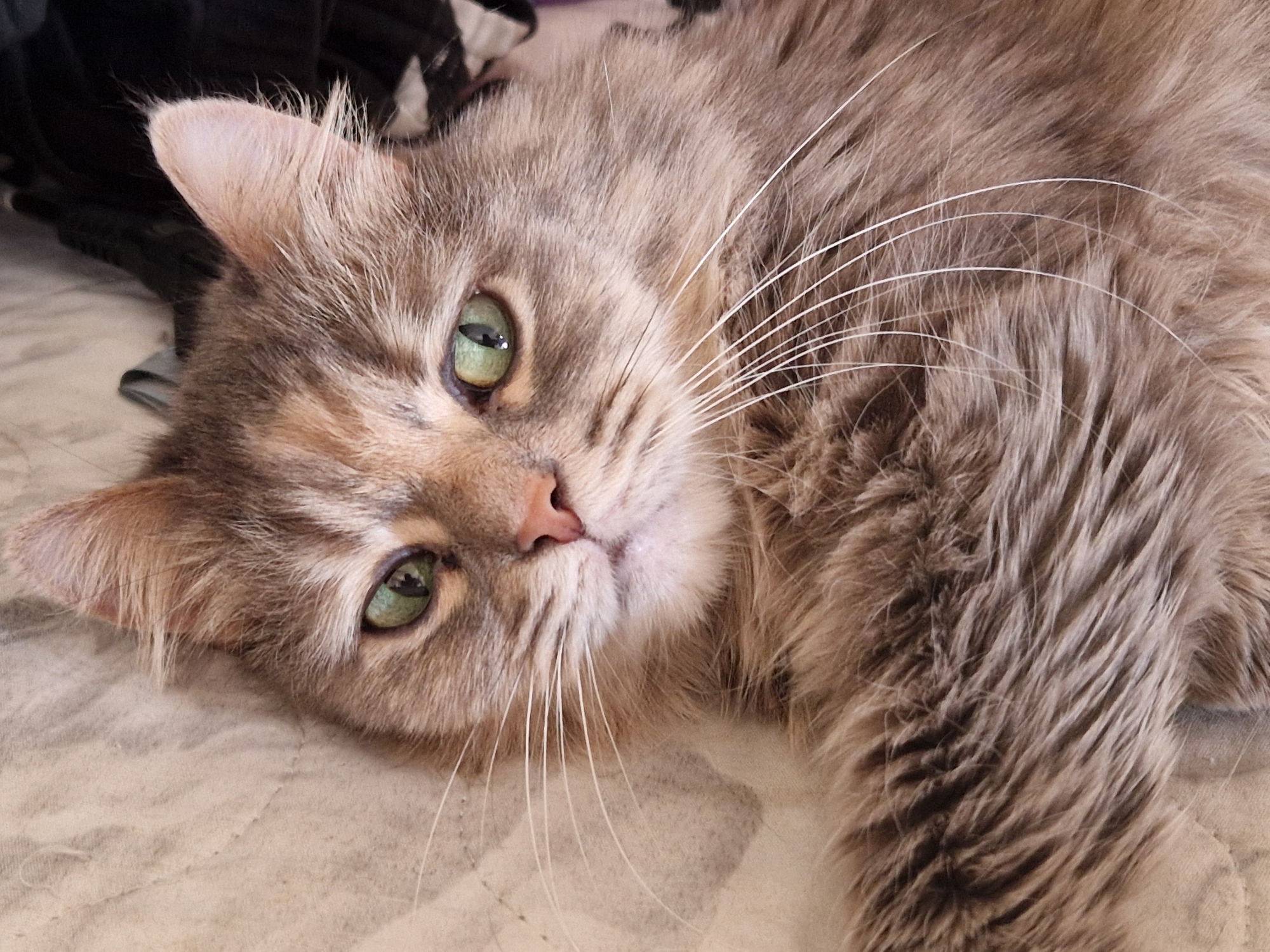 A medium-close, high-angle shot depicts a light-brown cat with green eyes, lying down on a patterned surface. The cat is angled towards the viewer and looking up. The cat has long white whiskers and fur that appears soft. The background is slightly blurred, showing a black and white object.