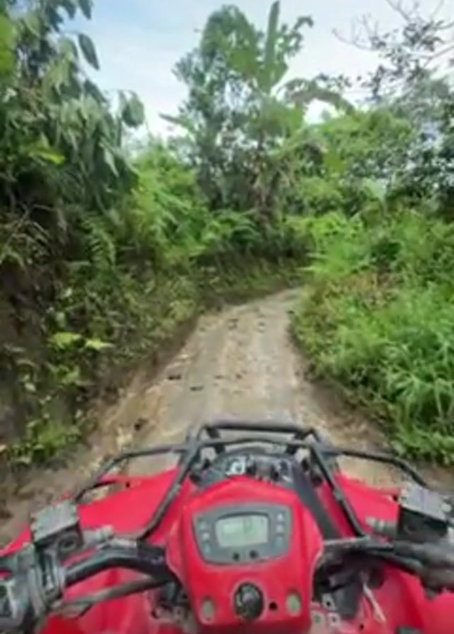 first-person perspective from a red ATV driving on a dirt path through a lush, green environment. The path is muddy and rocky, lined with dense vegetation, including ferns, trees, and banana plants. The sky is overcast, suggesting it may be a humid climate. The ATV's dashboard and handlebars are visible, with a digital display showing a reading of 0. The ATV is moving slowly, navigating the uneven terrain.