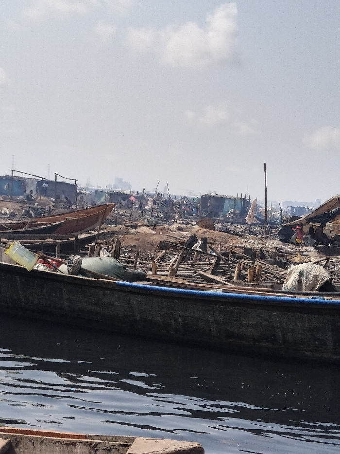 This image depicts a wide view of a waterfront settlement in Iwaya, Nigeria, characterized by significant structural damage and debris under a hazy sky