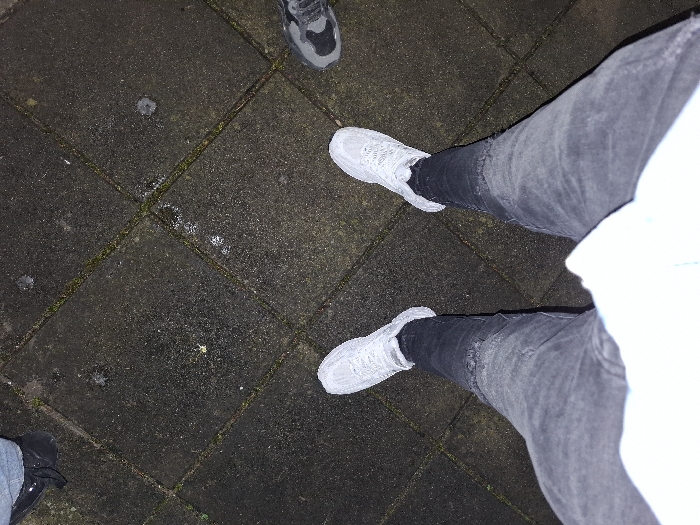 The scene depicts a top-down view of a paved outdoor area, presenting the lower extremities of two individuals. The specific location within the city of Veliki Preslav, Bulgaria, cannot be identified from the visual information. The primary subject occupies the majority of the frame, viewed from the waist down. This individual is wearing light-colored, possibly white, athletic-style lace-up shoes and dark grey or black distressed skinny jeans featuring visible tears and frayed fabric on the knees and upper thighs. A light-colored garment, possibly a hoodie or shirt, is visible at the bottom of the frame, covering the upper leg area. In the upper right corner of the image, the left foot of a second individual is partially visible. This person is wearing a dark grey and black athletic shoe with a light-colored sole. The ground surface is composed of rectangular paving slabs, dark grey in color and arranged in a grid pattern with visible seams. The pavement shows signs of wear, accumulated dirt, and patchy areas of greenish growth, consistent with moss or grime. Scattered across the slabs are several small, irregular white marks, suggestive of splatter or droppings, and a distinct small yellowish spot near the center of the frame. The overall lighting is dim, indicating conditions such as dusk, night, or an overcast environment. No discernible actions or interactions beyond standing are visible.