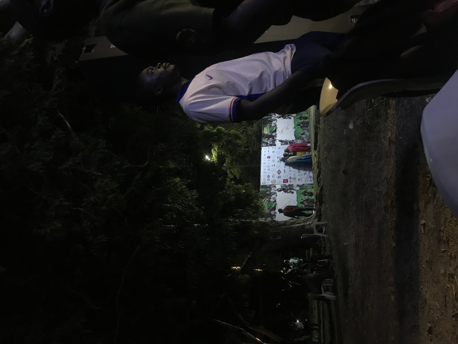 An outdoor gathering at night features a light-skinned person in a white and blue t-shirt in the foreground