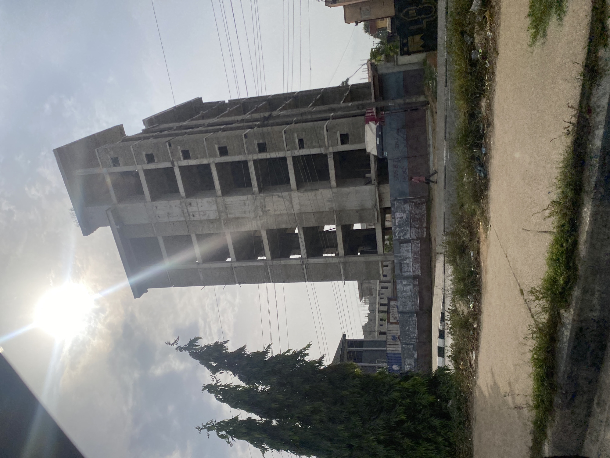 The image depicts an urban street scene in Ikeja, Nigeria, under bright daylight with a strong sun glare in the upper left quadrant of a partly cloudy sky. The central feature is an unfinished multi-story building, approximately nine stories high, constructed from an exposed concrete frame and masonry blocks, displaying multiple open window apertures. To the left, three tall, slender evergreen trees with dense green foliage stand prominently. The foreground presents a paved road or pathway, bordered by a concrete curb and a median strip containing sparse green vegetation and scattered debris. Across the mid-ground, a dark-colored corrugated metal fence, featuring faded white markings, serves as a boundary for the construction site and other background structures, including smaller, partially completed buildings and a blue container-like unit. A single individual, dressed in a light-colored shirt and dark trousers, walks from left to right along the paved area in front of the fence. Overhead power lines are visible horizontally across the upper mid-ground.